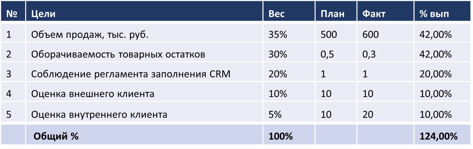 Так, при плане в 4 млн руб, сотрудник продал на 4,2 млн, при этом вес цели равен 35%. Расчет будет следующим: (4,2 / 4) * 35 = 36,75%.