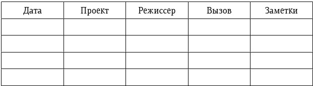 Пробы. Фиксировать пройденные пробы в отдельной вкладке полезно сразу по нескольким причинам. В первую очередь через некоторое время вы сможете проследить, какой процент утверждений был у вас раньше и насколько вам удалось улучшить ситуацию. Скажем, если в течение прошлого месяца вы прошли 15 прослушиваний и были утверждены на три проекта, то процент утверждений 20 %. Текущая ситуация может быть такой, что вы проходите пять прослушиваний в месяц, но все пять – успешные, то есть процент утверждений 100 %! В начале вашего пути можно посещать все пробы, чтобы познакомиться с кастинг-директорами или режиссерами. Вас также могут заранее предупредить о том, что вы не подходите на роль по возрасту, но предложат познакомиться с режиссером. Так бывает не всегда, а только в случае, если вы знакомы лично с кастинг-директором, и он заинтересован в вашем росте. Но приходит время, когда актер должен стремиться не к тому, чтобы посетить как можно больше проб, а к тому, чтобы процент утверждений был достаточно высок.