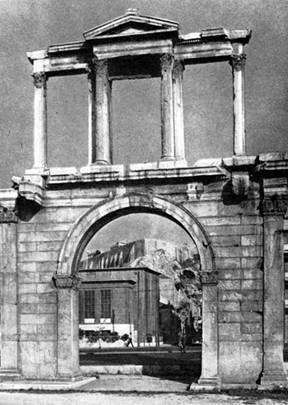 СократПосетителям современных Афин трудно не заметить арку, расположенную невдалеке от проспекта королевы Амалии. Непохожие друг на друга, части этого странного сооружения представляют различные направления в зодчестве так, словно воплощают черты, некогда отличавшие римлян и греков. Помпезный римский дух отразился в форме основания: массивная мраморная стена прорезана арочным пролетом, по обеим сторонам которого в свое время стояли колонны с пышными капителями. Ее венчает изящный портик, или галерея, на тонких столбах, с антаблементом и небольшим фронтоном – деталями, характерными для греческой архитектуры.