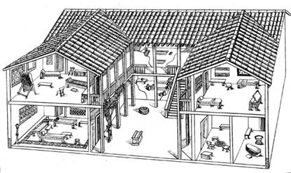 В демократических Афинах не было дворцов. Полноправные граждане жили в домах, возведенных из сырцового кирпича на деревянном каркасе, но отличавшихся от хижин большими размерами и удобством. Городские жилища часто имели два уровня, поскольку знатному эллину требовались комнаты для себя, своей жены, дочерей и многочисленных рабов. Здания располагались вокруг внутреннего дворика, в котором находились алтарь, чахлые растения и колодец. Самое просторное помещение первого этажа – андрон – занимал хозяин. Здесь он работал, отдыхал, принимал гостей, не вставая с деревянного ложа. По другую сторону двора находились кухня, ванная и комната, посвященная богине Гестии, где семья собиралась вокруг очага. В классическую эпоху окруженный колоннами внутренний двор греческого дома именовался перистилем.