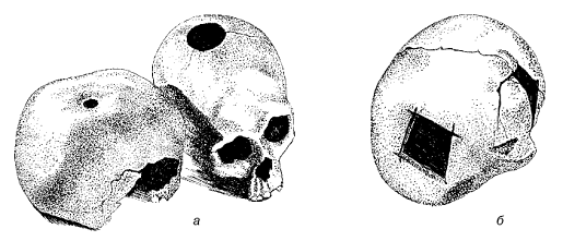 Техника трепанации (от франц. trepan – «бурав») стала привычной в эпоху неолита, но была разработана, вероятно, еще в позднем палеолите. В кости черепа вырезали 1 – 5 круглых отверстий в стандартных зонах головы: в теменной или затылочной части. Наросты по краям отверстий доказывают, что пациенты выживали после этой опасной процедуры в 70 процентах случаев. Отсутствие костной мозоли свидетельствует о смерти больного вскоре после операции. Черепа со следами трепанации находили во всех частях земного шара, за исключением Австралии, Малайского архипелага, Японии, Китая и территории, прилегающей к пустыне Сахаре. Трепанация до сих пор практикуется в диких племенах Океании и Центральной Африки. На островах Тихого океана так лечили эпилепсию, головные боли и умопомешательство. Племена острова Новая Британия применяли трепанацию как средство, обеспечивающее долголетие.