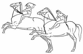 Универсальные бойцы эквиты, одетые в туники, в одинаковой мере владели многими видами оружия. В седле они разили противника копьем, а в пешем поединке переходили на меч. В качестве средств защиты им полагался плоский шлем с забралом, легкие нагрудные латы, тугая повязка на руке и небольшой круглый щит.