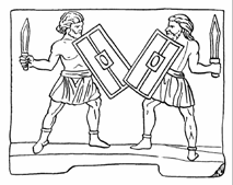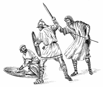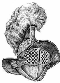 В эпоху расцвета гладиаторских игр существовало четкое разделение участников соревнований, определявшееся именно национальными традициями. Фракийцы предохраняли лицо простым открытым шлемом с нащечниками, держали в руках небольшой круглый щит, а сражались коротким мечом с искривленным лезвием. Самниты выделялись пышными султанами на шлемах и держали прямые короткие мечи в руке, защищенной панцирной перчаткой. Их богатые доспехи состояли из большого щита, бронзовых нагрудных лат и двух поножей – металлических пластин, надеваемых на голени.