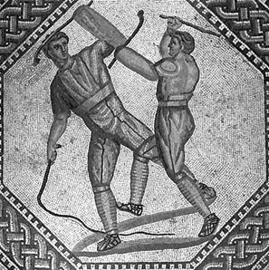 Лаквеарии имели похожее снаряжение, но вместо сетки использовали лассо. С ретиариями обычно сражались секуторы, которые носили гладкий глухой шлем, плотно прилегавший к голове. Гопломахи сменили самнитов во времена Империи. Выходя на арену в роскошном шлеме с забралом и поножами на одной ноге, они сражались против мирмиллонов – гладиаторов, выступавших босиком. Наиболее экзотическими считались поединки андабатов, дравшихся вслепую, поскольку их голову защищал глухой шлем без прорезей для глаз. Гладиаторы этого вида вели бой, ориентируясь на слух, выкрики зрителей, однако больше полагались на покровителя судьбы – бога Фата.