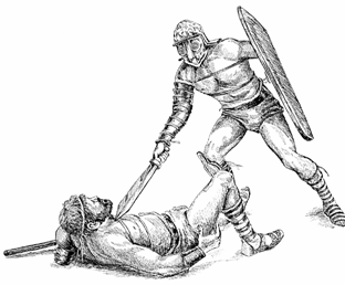 Беззаботная публика, удобно разместившаяся на высоких трибунах, равнодушно взирала на арену, где сражалось около 60 пар гладиаторов. Начало боя не сулило интересных моментов. Давно привыкшие к жестоким зрелищам плебеи и патриции не вдохновлялись видом сверкающих доспехов, тяжелого оружия, красотой мускулистых тел и первой крови, проливавшейся на свежий песок. Атмосфера в амфитеатре накалялась по мере уменьшения количества бойцов. Каждая эффектная атака сопровождалась рукоплесканием, каждая ошибка – выкриками и оглушительным свистом. Самое интересное происходило в конце представления, когда на поле оставалась последняя пара. К тому времени мертвецкая амфитеатра до отказа наполнялась окровавленными телами, а публика с нетерпением ожидала кульминации боя. Поверженный гладиатор с тоской смотрел на противника, зная, что живет в этом мире последние секунды. Ликующие зрители дружно выставляли руки с опущенными вниз пальцами, единодушно выражая свою волю: «Пусть умрет!». Проигравший опускался на колени, наклонял голову и, пронзенный мечом, беззвучно падал на арену. Изможденный победитель принимал из рук организатора пальмовую ветвь и уходил, уступая место следующим парам. Игры продолжались до тех пор, пока зрители, обессилев от жары и кровопролития, не начинали расходиться по домам.