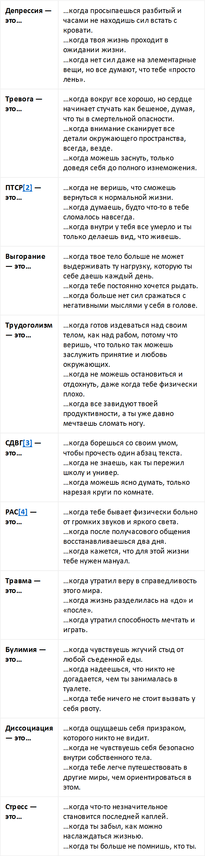 Майкл Поллан, известный автор книг о питании, говорит о том, что «состав продукта должен быть понятен вашей бабушке»[3]. Я предлагаю поиграть в игру и сделать понятными распространенные фразы, диагнозы и слова, которыми мы часто бросаемся не раздумывая и которые уже настолько затерлись, что перестали вызывать какую-либо реакцию внутри. Сразу скажу, что мои варианты – это лишь описание единичных симптомов, а не всего явления, но я призываю хотя бы попробовать поиграть в словарик, чтобы найти формулировки, которые будут вызывать отклик. Это похоже на фантики от жвачки «Love is…», где любовь объяснялась при помощи простых картинок и надписей типа «Любовь – это… когда можно вместе молчать».