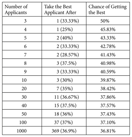As it turns out, following this optimal strategy ultimately gives us a 37% chance of hiring the best applicant; it’s one of the problem’s curious mathematical symmetries that the strategy itself and its chance of success work out to the very same number. The table above shows the optimal strategy for the secretary problem with different numbers of applicants, demonstrating how the chance of success—like the point to switch from looking to leaping—converges on 37% as the number of applicants increases.