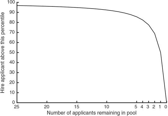 The easiest way to understand the numbers for this scenario is to start at the end and think backward. If you’re down to the last applicant, of course, you are necessarily forced to choose her. But when looking at the next-to-last applicant, the question becomes: is she above the 50th percentile? If yes, then hire her; if not, it’s worth rolling the dice on the last applicant instead, since her odds of being above the 50th percentile are 50/50 by definition. Likewise, you should choose the third-to-last applicant if she’s above the 69th percentile, the fourth-to-last applicant if she’s above the 78th, and so on, being more choosy the more applicants are left. No matter what, never hire someone who’s below average unless you’re totally out of options. (And since you’re still interested only in finding the very best person in the applicant pool, never hire someone who isn’t the best you’ve seen so far.)