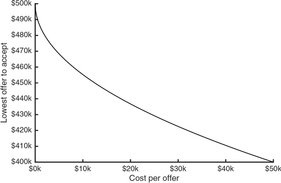 Having this information, we don’t need to look noncommittally to set a threshold. Instead, we can set one going in, ignore everything below it, and take the first option to exceed it. Granted, if we have a limited amount of savings that will run out if we don’t sell by a certain time, or if we expect to get only a limited number of offers and no more interest thereafter, then we should lower our standards as such limits approach. (There’s a reason why home buyers look for “motivated” sellers.) But if neither concern leads us to believe that our backs are against the wall, then we can simply focus on a cost-benefit analysis of the waiting game.