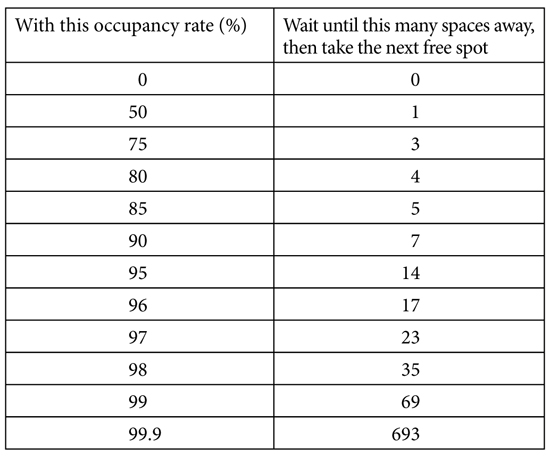 Assume you’re on an infinitely long road, with parking spots evenly spaced, and your goal is to minimize the distance you end up walking to your destination. Then the solution is the Look-Then-Leap Rule. The optimally stopping driver should pass up all vacant spots occurring more than a certain distance from the destination and then take the first space that appears thereafter. And the distance at which to switch from looking to leaping depends on the proportion of spots that are likely to be filled—the occupancy rate. The table on the next page gives the distances for some representative proportions.