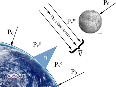 Внешнее давление P0 выталкивает воду на такую высоту h, чтобы давление вытеснений воды скомпенсировало разность давлений (P0 – Pve). Так как Луна вращается вокруг Земли, то за ней движется выступающий гребень океана.