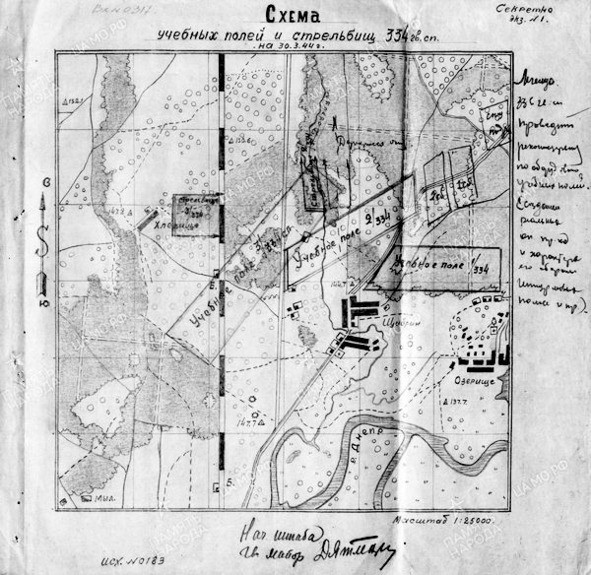 Схема учебных полей и стрельбищ 334 гв. СП Описывает период с 30.03.1944 по 30.03.1944 г. Схемы. № документа: 183, даты создания документа: с 30.03.1944 по 30.03.1944 г. Архив: ЦАМО, Фонд: 1330, Опись: 0000001, Дело: 0024, Лист начала документа в деле: 65 Авторы документа: 334 гв. сп