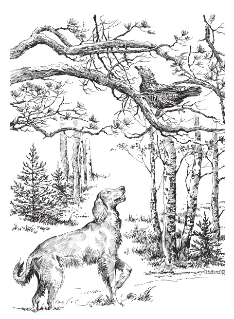Все это старая Глухарка видела с вершины сосны. Она сидела там, еще долго дрожа от страха, что Человек, самый опасный враг глухарей, и его Собака могут вернуться к ее гнезду. Мелкий частый холодный дождь все капал и капал с неба, проникал ей под перья. Глухарке было холодно, но она, съежившись и дрожа, все сидела на вершине дерева и смотрела в сторону, куда ушли ее враги.