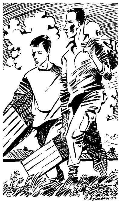Он лежит сзади Нефедова, чуть сбоку, в тридцати метрах. Его лежка метра на два выше лежки лейтенанта.