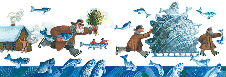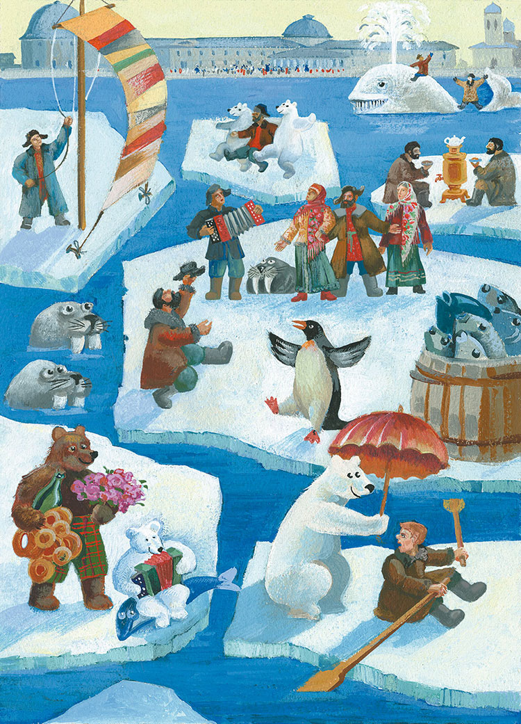 А в большой праздник да возьмутся пингвины с белыми медведями хороводы водить, да еще вприсядку пустятся, ну, до уморенья! А моржи да тюлени с нерпами у берега в воде хлюпают да поуркивают – музыку делают по-своему.