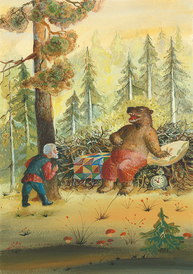 Медведь на задни лапы выстал, запотягивался, вовсе как наш брат мужик, когда на печку али на полати ладится. Мишка и спину, и бока чешет и зеват во всю пасточку: ох-ох-охо! Залез в берлогу, ход хворостиной заклал.