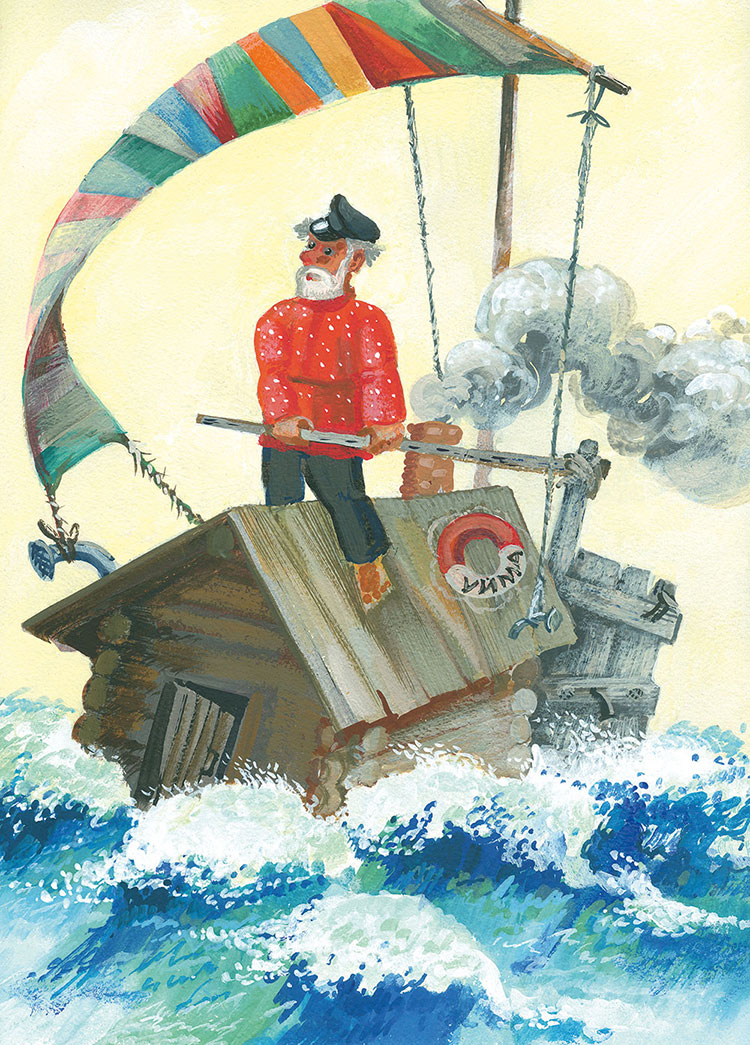 Я недолго думал. Столкнул баню углом в воду, в крышу воткнул жердину с половиком – вышла настояща мачта с парусом. Стару воротину рулем оборотил. Баню натопил, пару нагонил, трубой дым пустил.