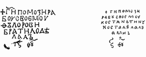 Надпись Косты выведена гораздо свободнее. Буквы ее мельче, не такие угловатые. Между словами иногда есть промежутки; буква «ять» выдается над строкой. Но важнее всего то, что Коста пользовался и несколько иной орфографией. Так, в слове «рабу», где Братило передавал, как было принято в глубокой древности, звук «у» через две буквы – «о» и «у» («рабоу»), Коста писал просто «у» («рабу»), как писали позже и как мы пишем теперь. Все эти отличия далеко выходят за пределы обычного различия почерков двух людей. Они указывают на то, что Коста писал много позднее Братила.
