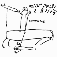 Ученик был мальчик и, стало быть, как все новгородцы, будущий воин. Он, конечно, мечтал о воинской славе и попытался нарисовать сражение двух воинов. Вот враг повержен и пронзен копьем, а над фигурой конного победителя написано «Онфим».