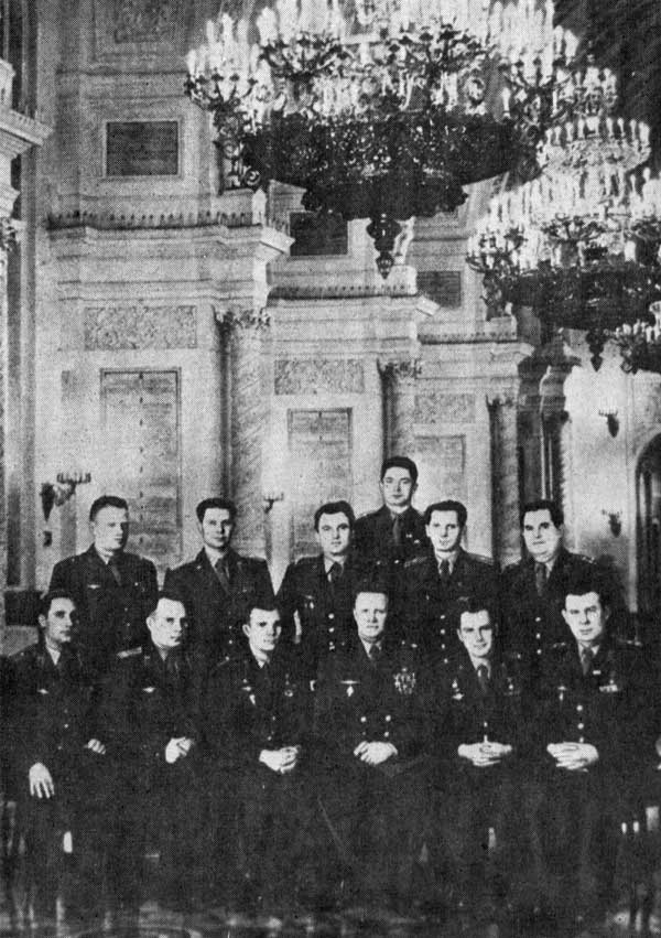 Группа летчиков – делегатов XXII съезда КПСС с космонавтами Ю. А. Гагариным (третий слева в первом ряду), Г. С. Титовым (второй справа в первом ряду), маршалом авиации С. И. Руденко (третий справа в первом ряду). Первый справа в первом ряду – М. М. Глебов. Георгиевский зал Кремля. Октябрь 1961 г.