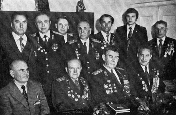 После урока мужества в Минском энерготехникуме. Первый ряд (слева направо): А. П. Захаров, Ф. И. Попивпиков, Герои Советского Союза М. М. Глебов, В. Г. Ксензов, второй ряд: А М. Волков (второй слева), Герой Советского Союза Б. И. Ковзан (в центре), Д. И. Малько (третий справа), Я. В. Черниловскии (крайний справа). 7 мая 1982 г.