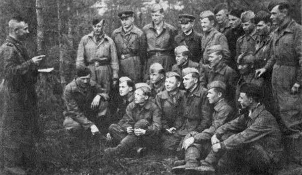 Майор Л. Хандобин (первый слева) проводит политинформацию с техсоставом