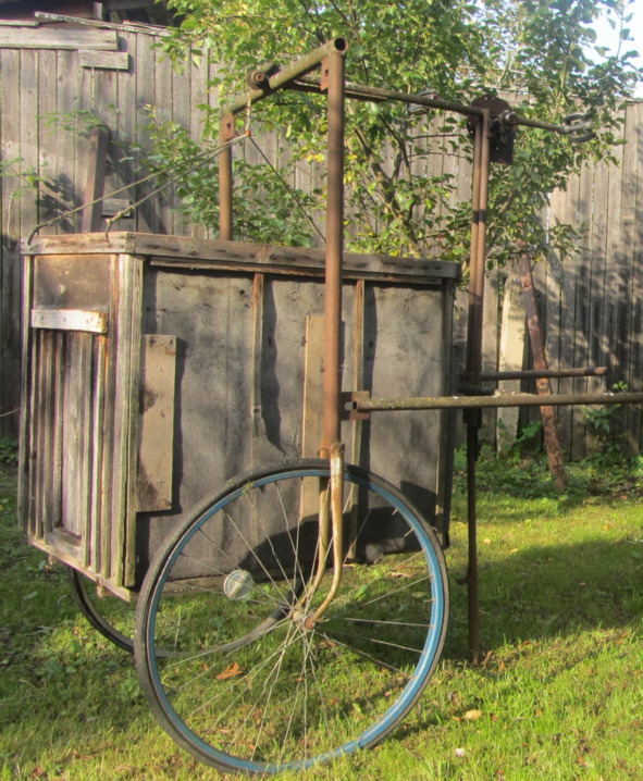 Она исполнена на двух велосипедных колёсах с передними вилками, каркаса из водопроводных труб и лебёдки, для которой используется велосипедная педальная каретка. Прикреплённый с одной стороны к пауку тросик, скользя по ролику, пропускается внутри горизонтальной трубы и закрепляется на оси каретки. Вставляя крючки паука в отверстия верхней обвязки улья и крутя педалями, можно поднять улей и переместить его куда нужно. С помощью тележки я спокойно справляюсь с перестановкой довольно громоздкого улья.