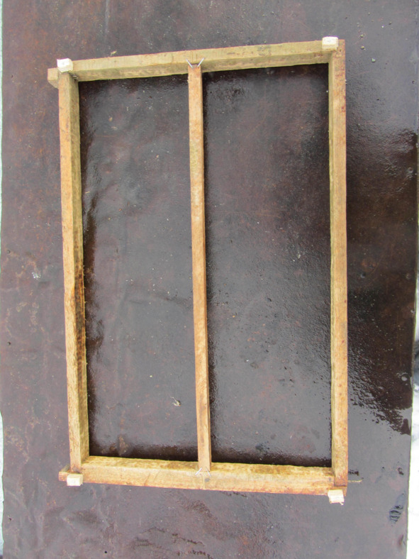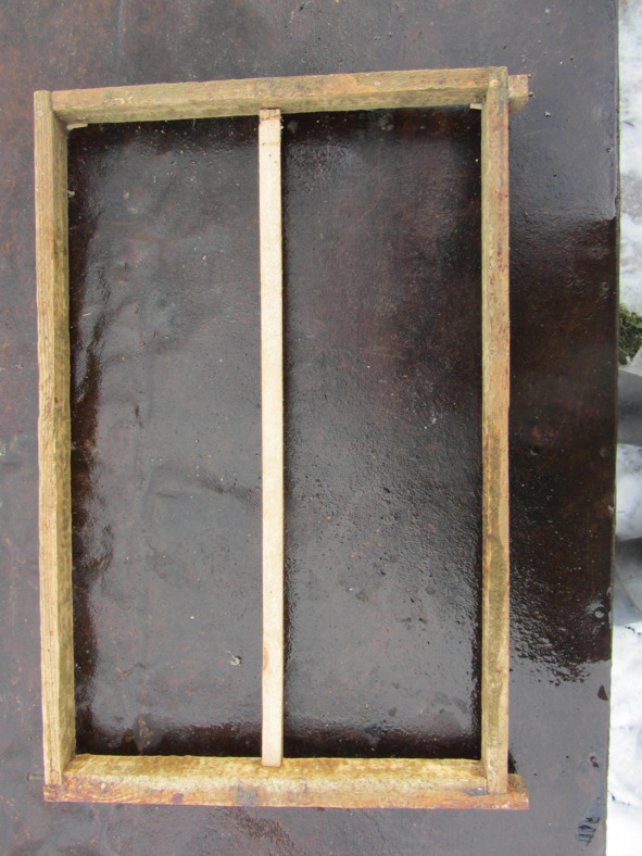 Достаточно одного продольного бруска 10х12 мм, чтобы соты были устойчивы при откачке. Старые соты в рамках легко удаляются, и все планки удобно очищаются. Для наващивания рамок вощина разрезается вдоль на две половинки и прикрепляется к брускам рамки расплавленным воском (кистью).