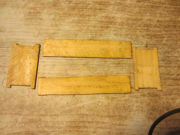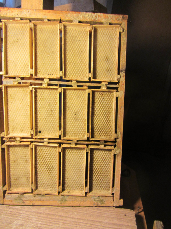Здесь я хочу также поделиться своими наработками по получению сотового мёда, которыми я занимался несколько лет. Вначале я остановился на очень простой конструкции сотовой рамочки. Её боковые стенки делаются из дранки (стружка рубанка), толщиной 0,5 мм. Материал для стенок выбирается прямослойный (сосна, ель) и по возможности влажный, тогда стружка из-под рубанка выходит гладкой, без заусенцев. Изгиб планки в углах облегчается с помощью беговки (надрез острым ножом в месте сгиба), причём линия надреза должна быть по лицевой стороне планки. В одном из углов планка склеивается расплавленным воском (стык сжимается утконосами). Дальше эта рамочка заполняется вощиной и приклеивается к планке воском с помощью кисточки. Такая рамочка требует мало времени и материалов для её изготовления, экологически чистая и привлекательная для покупателя. Недостаток её в том, что она не выдерживает транспортировки, сопровождаемой разрушением забруса и потёками мёда, поэтому я перешёл на другую конструкцию рамочки.