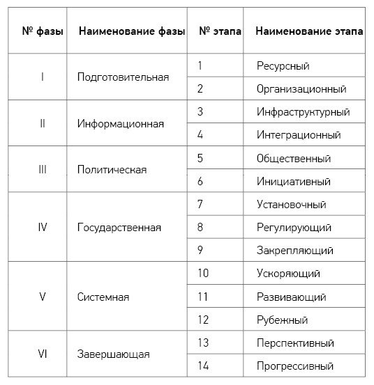 Итак, общий план трансформации нашего общества рыночного капитализма в прогрессивную созидательную технократию будет включать в себя 14 последовательных этапов, разделенных на шесть фаз.