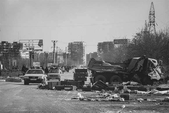 Заехали в черту города. Приблизились к черным «девяткам», которые до этого могли видеть на горизонте. Забежали во двор по улице Куприна. Здесь мы встретили стариков, замученных женщин, слегка странных молодых парней, одетых в гражданку. Все просили сигарет. Пожалуй, их в первую очередь вытащили из магазинов и продовольственных складов. У корреспондентов быстро закончились сигареты и любые другие угощения.