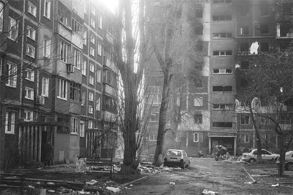Нужно признать, что это наиболее поврежденная часть города. Здесь все дома похожи друг на друга. Пустые бетонные коробки, без окон, с осыпавшимися подъездами, валяющимися кирпичами, сожженными автомобилями у подъездов.