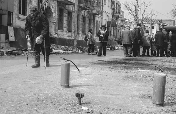 Здесь также весть о раздаче хлеба и воды разлетелась моментально. Очередь выстроилась не меньше той, что была на месте пробития нашего колеса. Люди не глядя обходили торчащие из асфальта хвостовики мин.