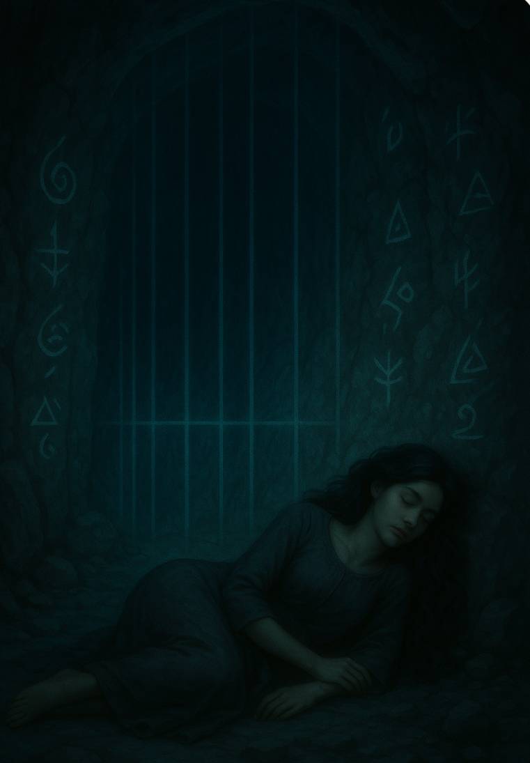 В мрачной пещере, где царила вечная тьма и сырость, девушка сидела, закованная в тяжёлые кандалы. Её тело было истощено, а руки покрыты синяками от долгого плена. Чёрные густые волосы скрывали её лицо, но даже сквозь них можно было увидеть, насколько она была бледна. Её дыхание было слабым, почти неощутимым, словно жизнь покидала её с каждым мгновением.