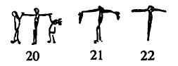 – Давай придумаем и нарисуем картинки для остальных звуков, – предложил своей дочке Тегумай. Они превосходно провели утро; в полдень закусили и вместо отдыха побегали и повозились. Когда дело дошло до звука «т», Тефи объявила, что, так как ее собственное имя, имена ее папочки и мамы начинались этим звуком, оставалось только нарисовать семейную группу: папу, маму и Тефи, держащихся за руки. Раза два можно было нацарапать такую сложную картинку, но когда пришлось то и дело рисовать три фигурки, Тефи и Тегумай стали изображать их все проще и проще, так что наконец звук «т» превратился в тонкого, длинного Тегумая с протянутыми руками, готовыми обнять Тефи и Тешумай. Посмотри на эти три картинки, моя милая, и ты отчасти поймешь, как это случилось. Вот они: