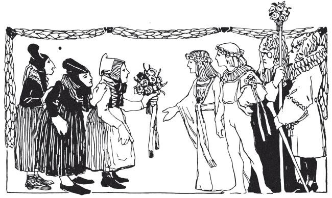 Когда девица показала королеве пустые комнаты и громадную кучу пряжи, та стала готовить свадьбу, и жених заранее радовался, что жена у него будет такая искусная и старательная, и нахвалиться ею не мог. «У меня есть три тетки, – сказала девица королеве, – и я от них много добра видела, так я и не могу забыть о них в счастье; а потому позвольте их пригласить на свадьбу и посадить с нами за один стол». Королева и жених сказали: «Почему бы нам это не дозволить?»