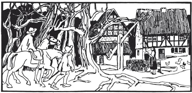 Пока она за тем питьем ходила, королевич уж успел отъехать, и слуга его, подтягивающий подпруги у своего седла, оставался один у домика, в то время как злая ведьма вернулась с питьем.