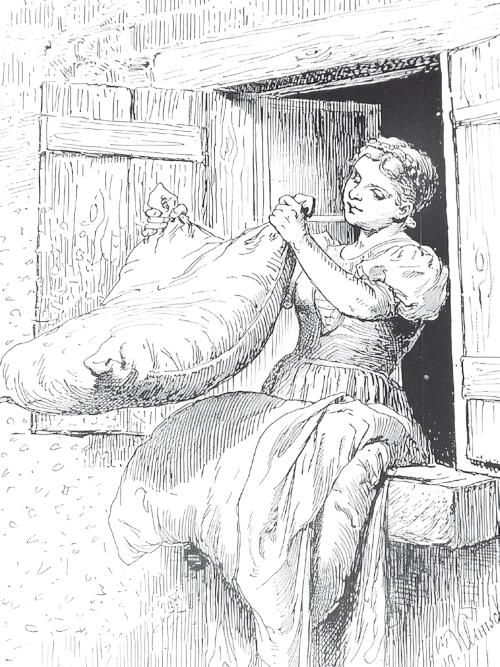 Речь старухи поуспокоила девушку и придала ей настолько мужества, что она согласилась поступить к ней в услужение. Она старалась угодить старухе во всем и перину ей взбивала так, что перья, словно снежные хлопья, летели во все стороны; зато и жилось ей у старухи хорошо, и бранного слова она от нее не слышала, и за столом у ней было всего вдоволь.