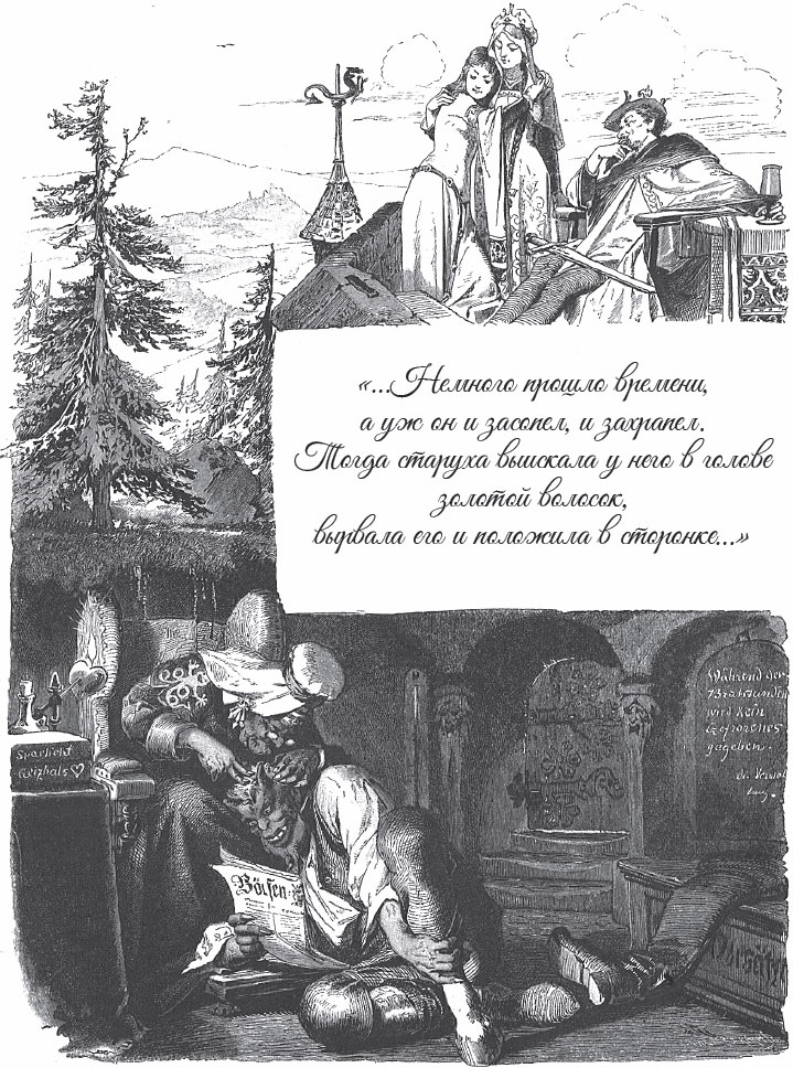 Немного прошло времени, а уж он и засопел, и захрапел. Тогда старуха выискала у него в голове золотой волосок, вырвала его и положила в сторонке. «Ай-ай! – крикнул черт. – Что это с тобой?» – «Да вот приснился мне такой нехороший сон, – отвечала ему мать, – что я тебя и ухватила за волосы». – «Что же такое тебе приснилось?» – спросил черт. «Приснилось мне, что фонтан на базарной площади, из которого некогда струей било вино, вдруг так иссяк, что теперь из него и воды не добыть… Что бы этому за причина?» – «Эх, кабы они только знали! – отвечал черт. – В том фонтане сидит под одним камнем жаба; и если они ту жабу убьют, так вино-то опять из него струей бить станет».