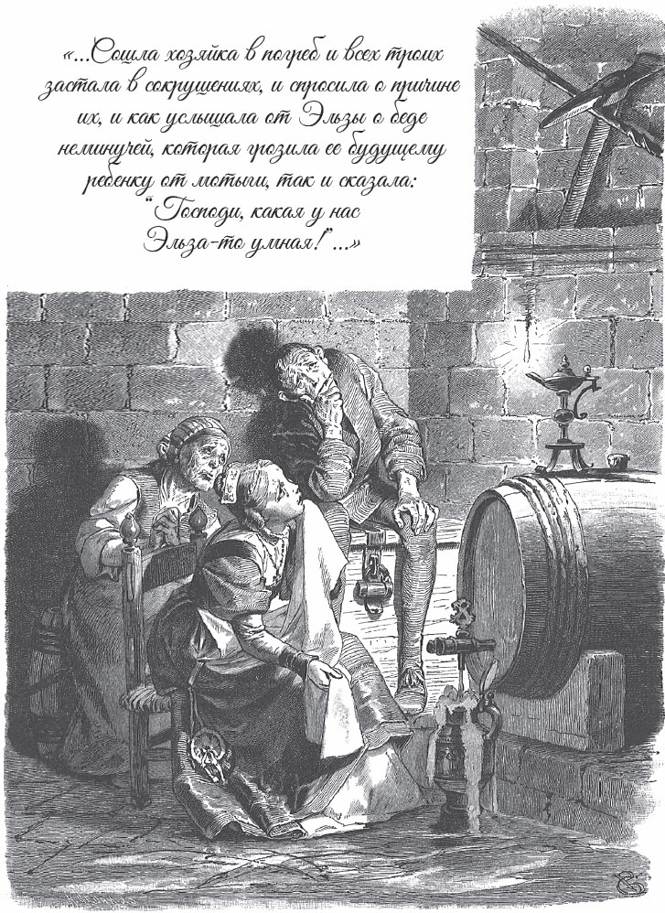 Ждал-пождал муж сколько-то времени, но когда увидел, что жена его не возвращается, а жажда его все больше и больше мучила, то он сказал себе: «Ну, видно, уж мне самому надо в погреб сходить да посмотреть, что там Эльза замешкалась?»