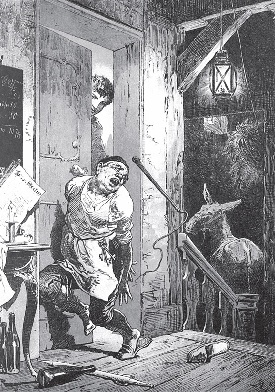 «…И тотчас же дубинка выскочила из мешка, наскочила на хозяина и давай его по всем швам разделывать! Хозяин стал кричать и молить о пощаде; но чем громче он кричал, тем сильнее выбивала дубинка в такт этому крику дробь по его спине, пока наконец он не упал в совершенном изнеможении…»