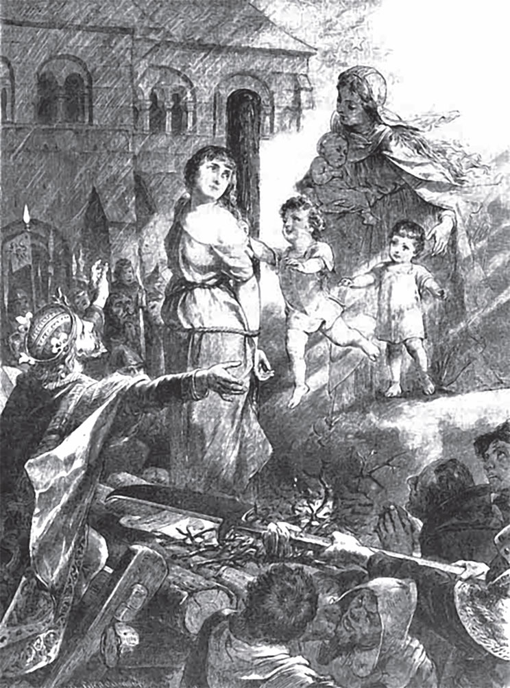 И в тот же миг полился дождь с небес и потушил пламя; ослепительный свет осиял осужденную, и Дева Мария сошла на землю с ее новорожденною дочерью на руках и обоими сыночками по сторонам.