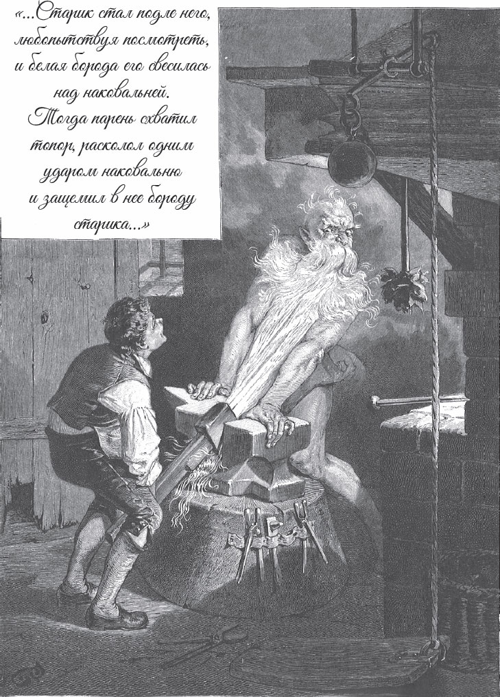 Старик стал подле него, любопытствуя посмотреть, и белая борода его свесилась над наковальней. Тогда парень схватил топор, расколол одним ударом наковальню и защемил в нее бороду старика. «Ну, теперь ты, брат, попался! – сказал он. – Теперь тебе помирать приходится!»