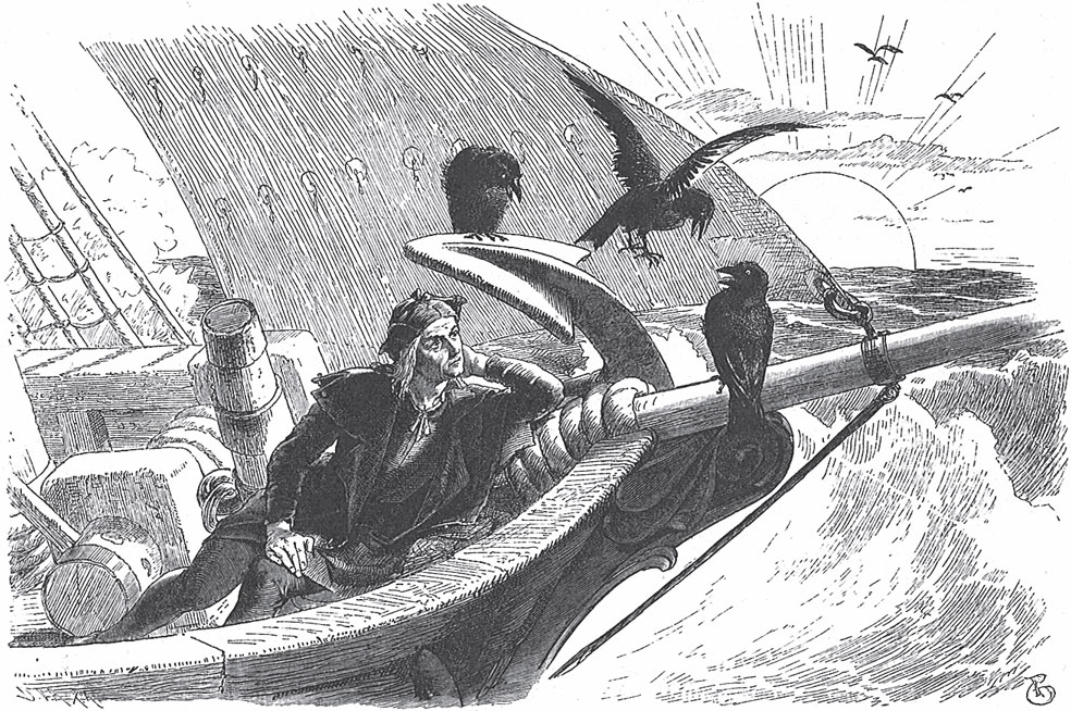 «…Случилось, однако же, что в то время, когда они мчались в открытом море, верный Иоганн, сидевший на носу корабля и кое-что наигрывавший на скрипке, увидел у себя над головою в воздухе трех воронов, которые летели вслед за кораблем с родины королевны. Тогда он перестал играть и стал прислушиваться, о чем они между собою переговаривались (он хорошо разумел их язык)…»