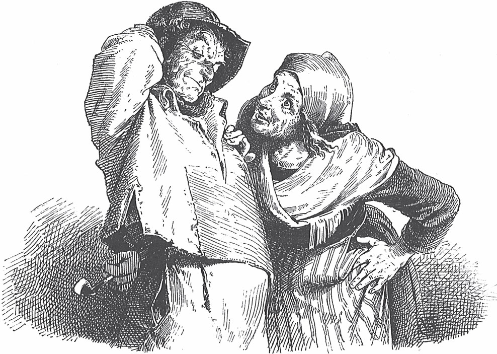 Поднялась баба на три лестницы со своим тяжелым коробом к портняжке в каморку и должна была перед ним все горшки с вареньем выставить. Он их все осмотрел и все понюхал, и сказал наконец: «Кажись, хороша штука! А ну-ка, тетка, отвесь мне этого добра лота с четыре, а то, пожалуй, и всю четверть фунта».