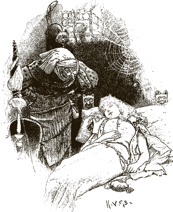Это был волшебный сон, который постепенно затронул каждого обитателя замка. Вернувшиеся домой король и королева, как только вошли в свои покои, тут же заснули. Задремали придворные, стражники и слуги, повар, поварята и кухарки. Забылись сном лошади в стойлах, собаки во дворе, голуби на крыше и мухи на стенах. Даже огонь, пылавший в очаге, застыл, а жаркое, которое на нём жарилось, перестало скворчать… И замер ветер, и на деревьях перестали шелестеть листья.