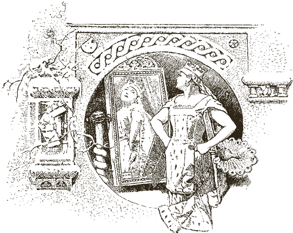 А между тем королева, вернувшись домой, встала перед зеркальцем и спросила: