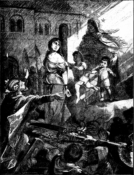 И в тот же миг полился дождь с небес и потушил пламя; ослепительный свет осиял осужденную, и Дева Мария сошла на землю с ее новорожденною дочерью на руках и обоими сыночками по сторонам.