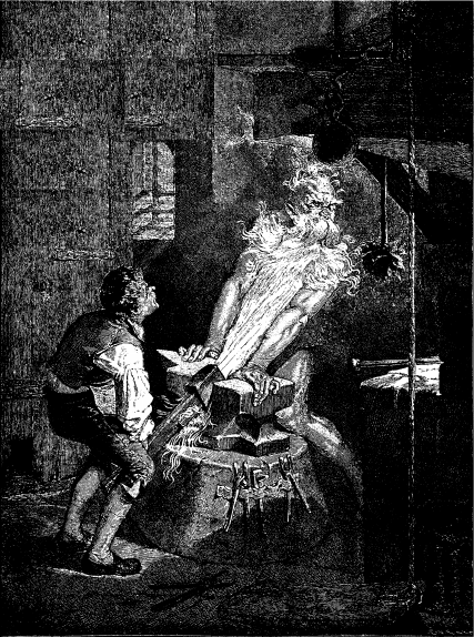 Старик стал подле него, любопытствуя посмотреть, и белая борода его свесилась над наковальней. Тогда парень схватил топор, расколол одним ударом наковальню и защемил в нее бороду старика…