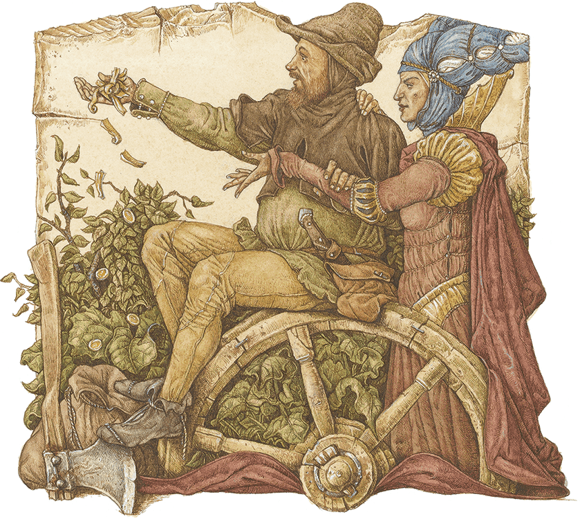Усердно трудился крестьянин – так, что только щепки летели. Вырезал он клин и вбил перед втулкой, чтобы колесо больше не слетало. Когда он закончил работу, говорит ему Госпожа Метелица: